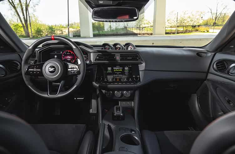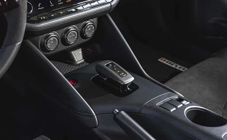 内饰采用黑色主色调,在细节上体现Nismo性能定位。方向盘12点位置增加红色对中标记,方便驾驶者在赛道场景下快速判断方向盘角度。方向盘3点、9点位置以及座椅部分材质采用Alcantara翻毛皮,该材质握感和防滑性能优于普通皮质,在激烈驾驶时提供更好的支撑。