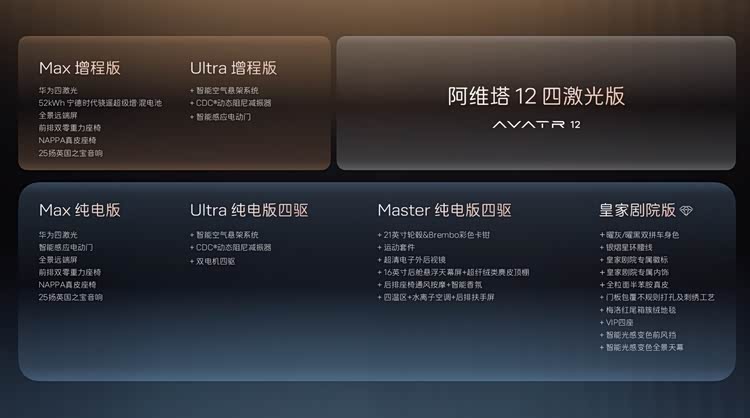 10月18日, 阿维塔12(参数|询价) 四激光版预售发布会在重庆旁观者设计博物馆举办,并宣布阿维塔*华为乾崑智驾®城市公开赛即将启动。阿维塔12 四激光版提供纯电与增程双动力,共推出6款车型。即日起至上市前下订,即可享2000元意向金抵扣5000元购车款的限时预售权益。