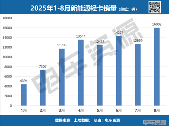 据电车资源行业研究院最新上险数据,2025年8月新能源轻卡市场销量达1.6万辆,同比增长84.4%;1-8月,新能源轻卡销量累计达9.2万辆,同比增长85.6%,销量持续走高,连续多月创下历史记录。