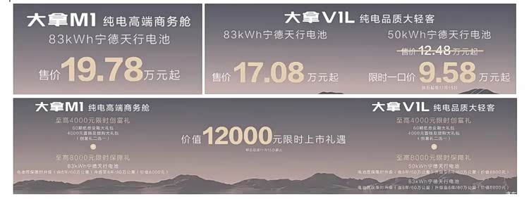 车家号·0浏览·2025-10-20 23:27 · 北京近日,我们从上汽大通MAXUS官方了解到,旗下多款车型完成上市,包含2026款大拿M1、2026款 大拿V1L(参数|询价)两款车型,覆盖专业物流、营运客运、定制改装等场景。其中,2026款大拿M1搭载83度宁德天行电池售价19.78万元起;2026款大拿V1L搭载83度宁德天行电池版售价17.08万元起/搭载50度宁德天行电池版售价12.48万元起,限时一口价9.58万元起。