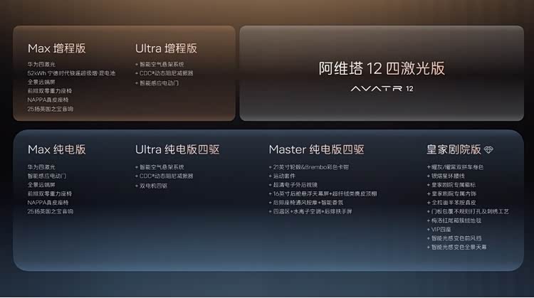 2025年10月18日, 阿维塔12(参数|询价) 四激光版预售发布会在重庆旁观者设计博物馆举办,并宣布阿维塔*华为乾崑智驾城市公开赛即将启动。阿维塔12 四激光版提供纯电与增程双动力,共推出6款车型。即日起至上市前下订,即可享2000元意向金抵扣5000元购车款的限时预售权益。