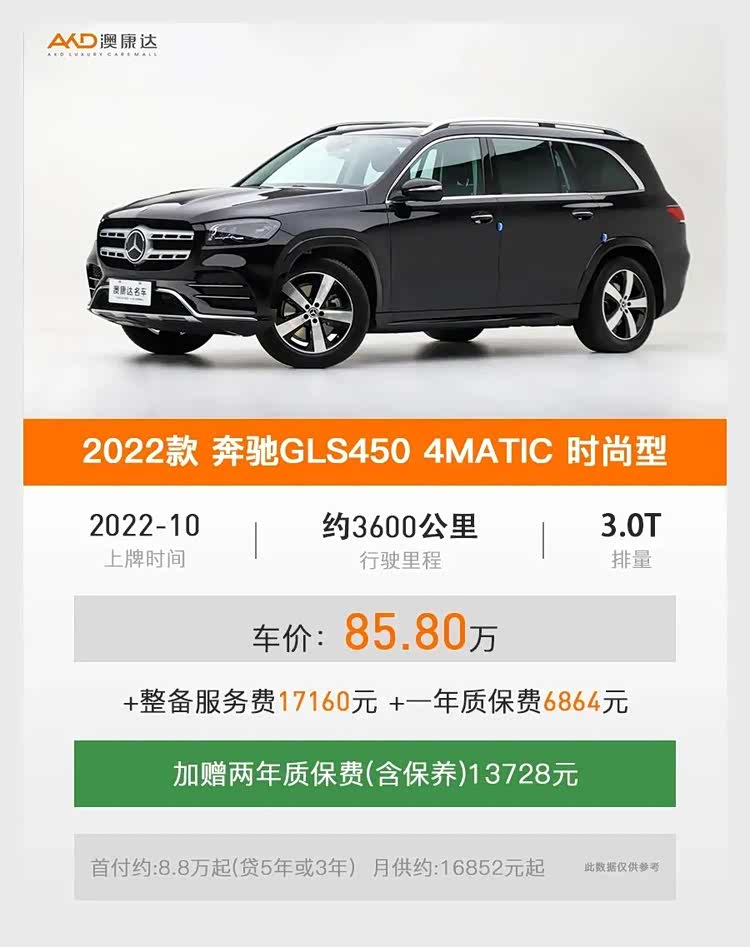 作为奔驰家族的旗舰SUV,GLS450天生自带“大佬光环”。这款行驶仅3600公里的准新车,几乎以新车九成价格,现售价仅需85.8万让你坐拥百万级气场与空间。它的优势在于“面面俱到”:三排七座布局满足全家出行,3.0T六缸动力从容稳健,豪华内饰与隔音水准营造出移动行宫般的静谧。