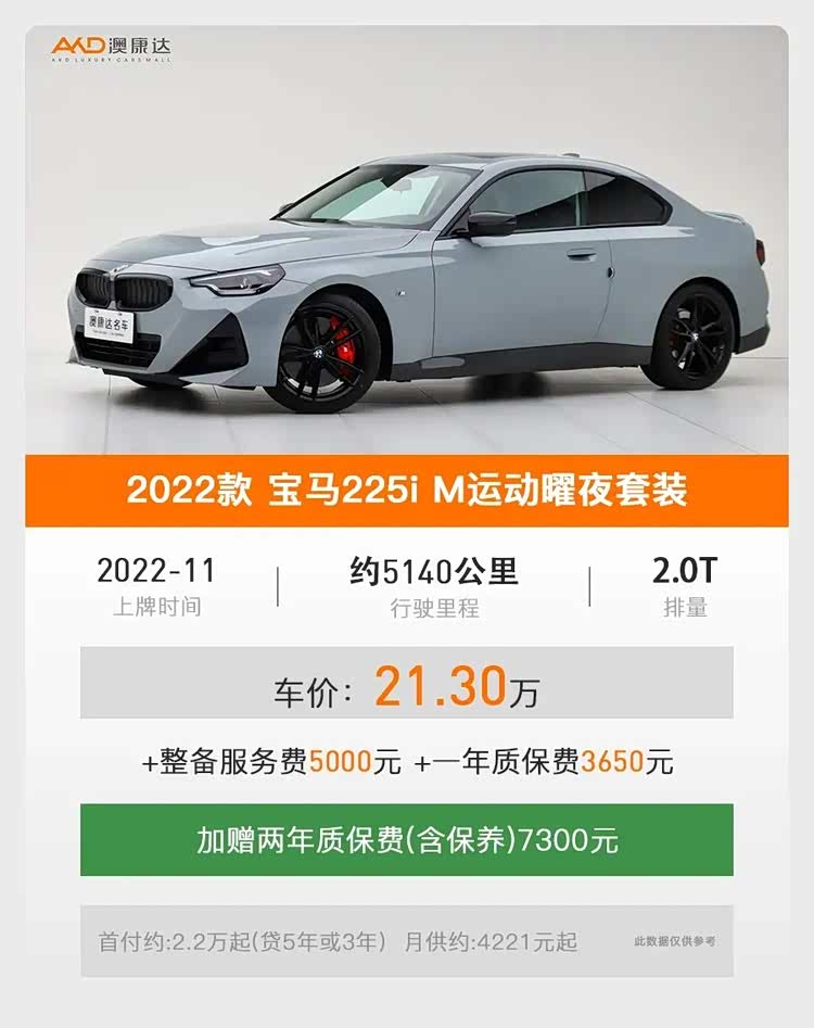 如果你认为“豪华”必须等于“昂贵”,225i会颠覆你的认知。这是一台充满乐趣的双门短轴宝马,5000公里的行驶记录意味着它几乎还未经历过风雨。曜夜黑化套件赋予它酷炫外观,开篷瞬间即可收获满分回头率;紧凑车身配合宝马经典操控,在城市中穿行游刃有余。用一辆普通B级车的价格,21.3万的售价拥有蓝天白云的标志与上乘的驾控体验,这笔买卖,怎么看都值。