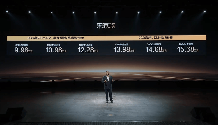 车家号·0浏览·2025-10-23 21:23 · 河南2025年10月23日晚,2026款比亚迪宋家族正式上市。此次,宋L DM - i推出三款车型,售价13.98万 - 15.68万元;宋Pro DM - i同样有三款车型,超级置换权益后限时售价9.98万至12.28万元。新车在外观、内饰、配置和续航上全面升级,综合竞争力显著提升。