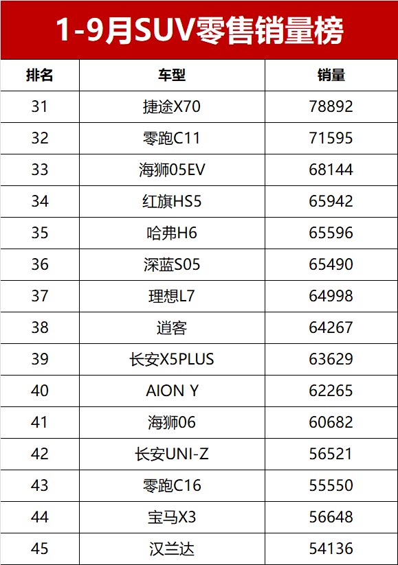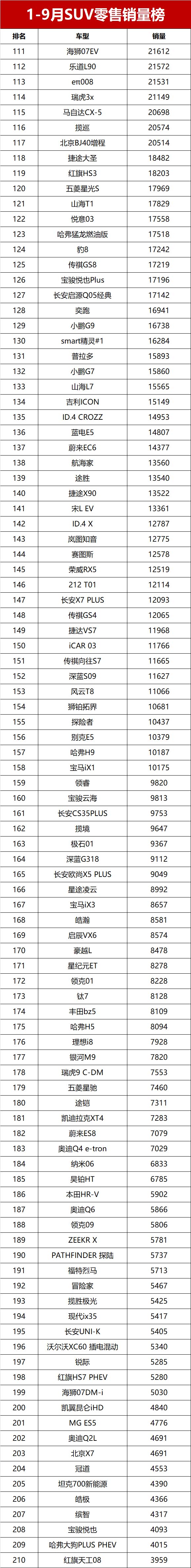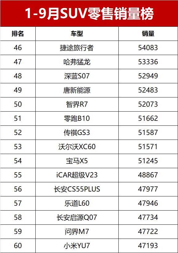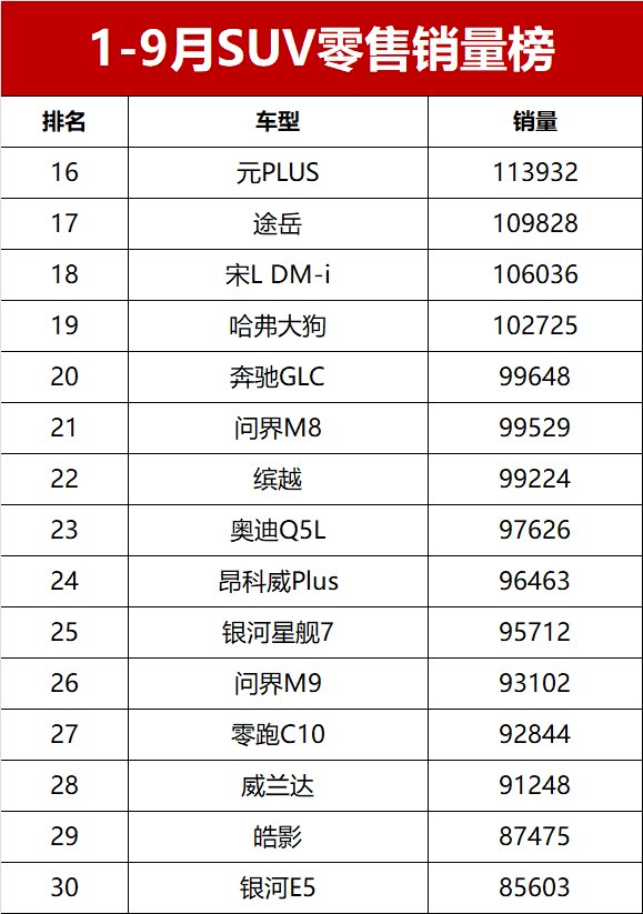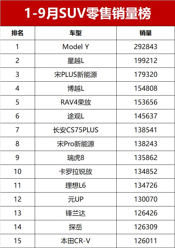 【2025年前三季度SUV零售销量排行榜 完整版】近日,乘联会公布了2025年前三季度乘用车销量数据。数据显示,2025年1-9月国内SUV市场累计零售销量达842.6万辆,同比增长10.4%,市场需求持续旺盛。前三季度月均销量破万辆的SUV车型共计28款,其中累计销量超过10万辆的热门车型达19款。新能源车型表现突出,夺得SUV零售销冠;燃油车凭借稳固的市场基础保持稳定输出,共有10款进入销量榜的前十五, 星越L(参数|询价)夺得燃油SUV销冠。变天了!前三季度SUV销量榜,1-410名,宋PLUS第三,星越L夺亚军!