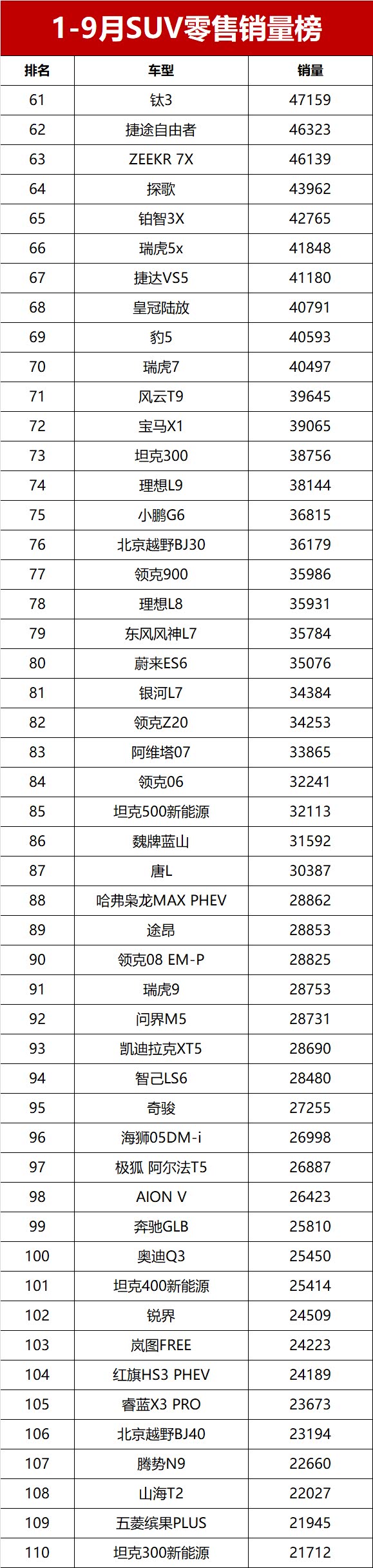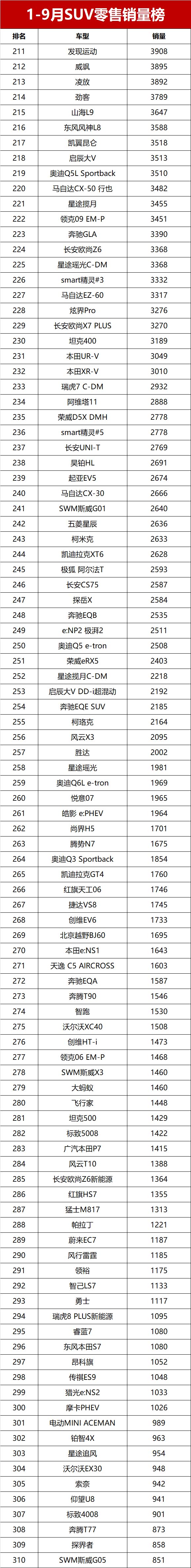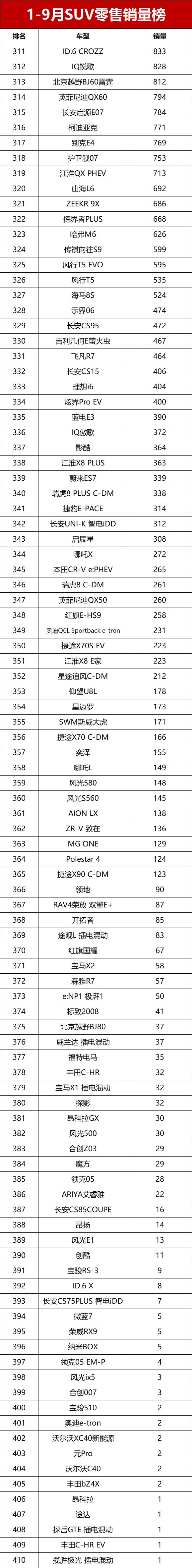 【2025年前三季度SUV零售销量排行榜 完整版】近日,乘联会公布了2025年前三季度乘用车销量数据。数据显示,2025年1-9月国内SUV市场累计零售销量达842.6万辆,同比增长10.4%,市场需求持续旺盛。前三季度月均销量破万辆的SUV车型共计28款,其中累计销量超过10万辆的热门车型达19款。新能源车型表现突出,夺得SUV零售销冠;燃油车凭借稳固的市场基础保持稳定输出,共有10款进入销量榜的前十五, 星越L(参数|询价)夺得燃油SUV销冠。变天了!前三季度SUV销量榜,1-410名,宋PLUS第三,星越L夺亚军!