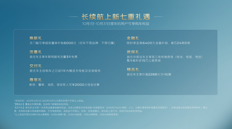 2026款银河E5长续航版的指导价为10.98万元起,全系售价区间为10.98万至14.58万元。在10月31日前,用户可享受6000元置换补贴、至高6400元金融补贴(含8万24期0息)、首任车主三电终身质保、免费充电桩及安装服务以及3M贴膜等限时权益。特定职业人士如教师和警察,还可额外获得2000元优惠,让一步到位的纯电生活更具吸引力。