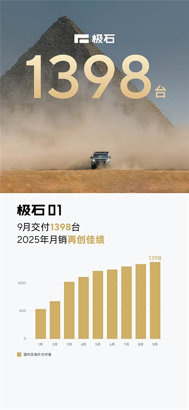 2025 年 9 月,极石 01 继续以 1398 台的交付成绩延续增长态势,在 30 万级中大型新能源 SUV 细分市场中持续突围。极石汽车坚持打造全场景全地形新能源SUV,为向往自然的家庭提供更优的出行产品,凭借对用户多元出行场景的深度洞察,通过针对性的技术配置优化,成功平衡了城市通勤、家庭出行与户外探险的核心需求,其市场表现印证了技术适配场景的产品开发逻辑有效性。