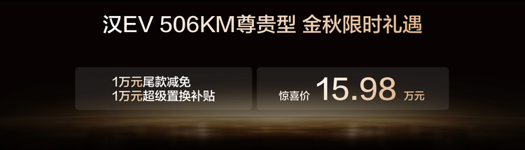 在产品之外,比亚迪更为所有的车主们准备了诚意十足的专属服务权益。其中,尊享取送车服务让汉车主无需亲自到店,可享专人取车到店和送车到家服务。同时,汉车主尊享泊车服务已覆盖高铁站、机场、医院三大场景,让用户停车就走,有专人帮助停车及送车。尊享服务,对汉车主全部免费!与此同时,针对搭载第五代DM技术的汉DM-i,比亚迪更将陆续推送油耗OTA,让车辆百公里亏电油耗从3.8升降低至3.35升,使车辆的能耗表现跃升至新高度!对于一直热销的汉EV 506KM尊贵型,比亚迪特别推出金秋限时礼遇,限时订车可享1万元尾款减免,再加1万元超级置换补贴(以上权益截至10月31日),惊喜价15.98万元!从五年前中国品牌高端化的破冰之作,到今天百万用户共同见证的价值标杆,汉家族始终以技术创新与用户需求双轮驱动,赋能用户美好用车生活。百万之上,初心未改,基于用户需求,汉长续航版震撼登场,六大豪华升级领衔,重塑主流中高端轿车价值新标杆!