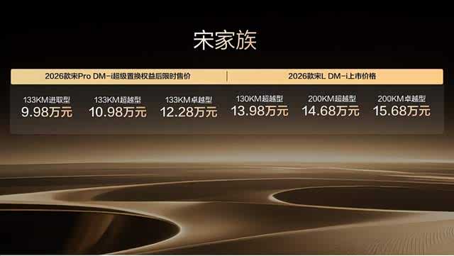 10月23日,比亚迪宋家族迎来重磅焕新,2026款 宋L DM-i(参数|询价)/宋Pro DM-i双车同步上市,限时售价9.98-15.68万元起。其中,2026款宋L DM-i售价13.98-15.68万元,2026款宋Pro DM-i超级置换权益后限时售价9.98-12.28万元。