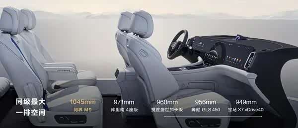凭借全新豪华D级平台和一体化压铸车身的优势,问界M9实现了MPV般的纯平地板,为车内三排提供了更为充裕的空间。具体而言,其前排空间达1045mm,二排为1060mm,三排接近1m,达到950mm,这些数据在同级车型中均处于领先地位。这样的设计使得乘员上下车更加便捷轻松,更确保了第三排乘员能拥有与前排相近的乘坐体验。