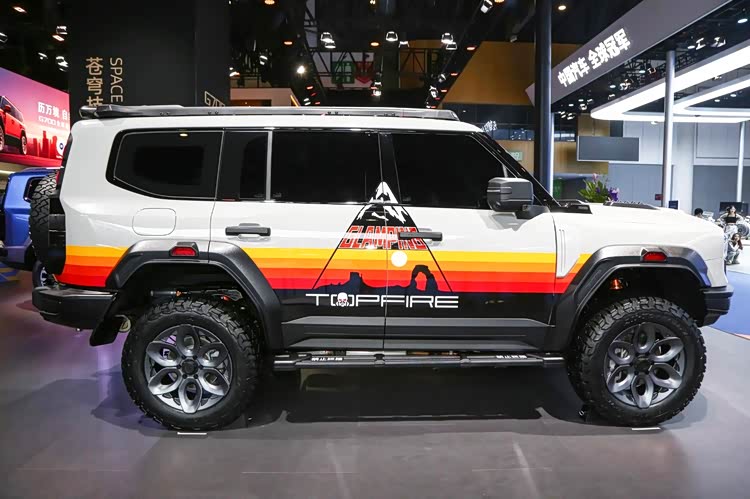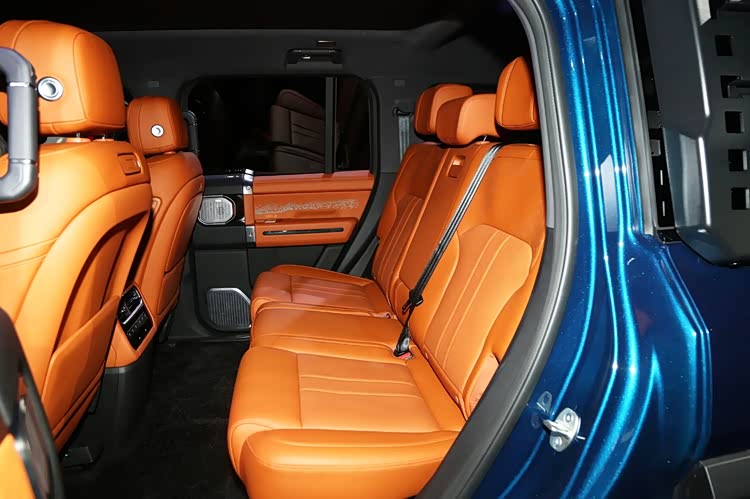 来到侧面,新车尺寸也是比较大的,车长5198毫米,车宽2050毫米,车高1950毫米,轴距2870毫米,并且这车是带空气悬架+CDC的,涉水深度达到了970毫米,所以整车体量感看起来是真的很大。