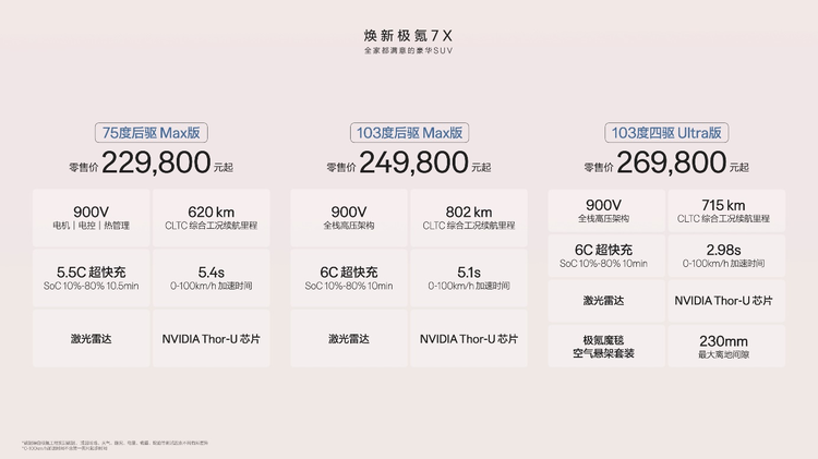 动力方面,焕新极氪 7X 后驱版车型峰值功率 370kW,四驱版前/后电机峰值功率 215/370kW,最大扭矩 812N·m。