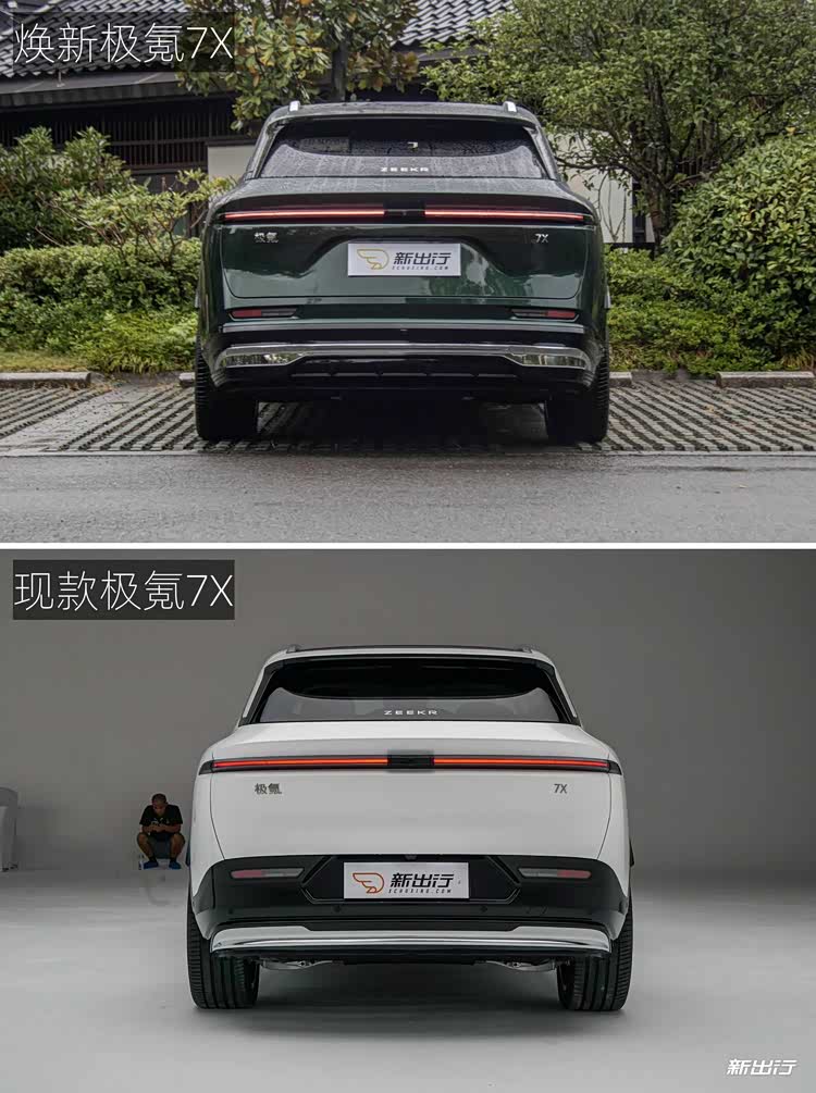 车尾方面,焕新极氪 7X 的车尾改动其实是相对保守的,一眼看过去似乎没有什么变化,但其实尾部视觉重心整体上移了,牌照框的位置从保险杠挪动到了尾门位置。