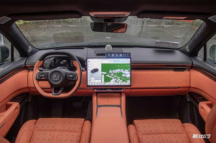 内饰方面,极氪 7X 整体的设计采用了环抱式的设计,硬朗的走线贯穿整个仪表台。整体配置上是由 13.02 英寸的机长仪表,以及36.21 英寸的 AR-HUD 抬头显示系统组成。