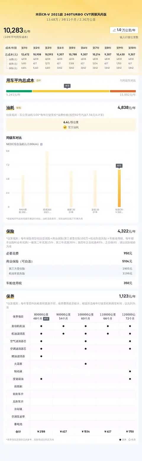 关于该车型的用车成本,年均综合费用约为人民币1.1万元左右。然而,实际费用会受到车主驾驶习惯、地区经济水平以及其他不确定因素的影响而有所变化。因此,上述费用仅为参考,具体费用应以实际使用情况为准。