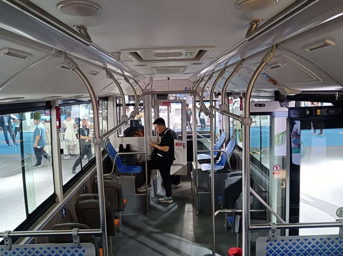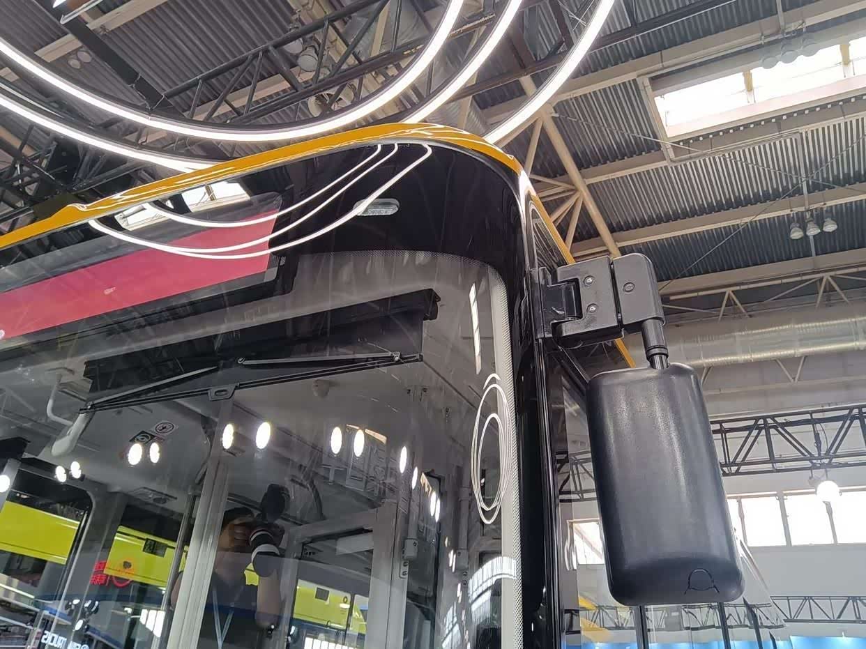 一体式后视镜外壳进行了降风阻优化,支架具备可折叠设计,方便车辆在通过街巷窄路会车时随时收起,增加车辆的通过性。此外,为了方便大流量人群上下车,车辆采用低入口设计,并在车辆右侧前、中部设有两个内摆门,车内通道宽敞,便于乘客在车内移动。