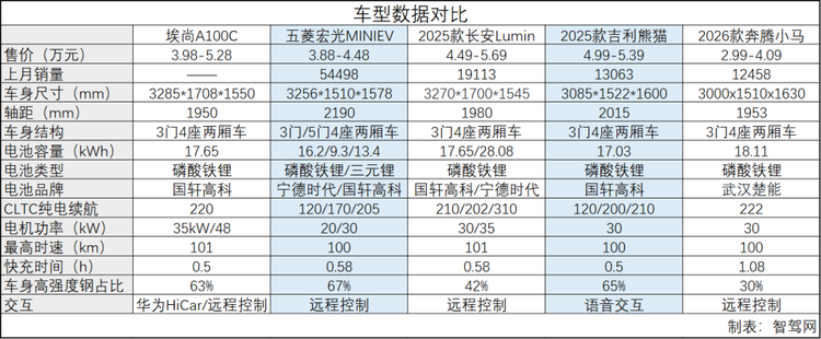 从智驾网统计的数据可以发现,单从产品力来看,埃尚A100C是一台配置给足、参数在线的微型车:220公里的标配续航、全系快充、10.25 英寸中控屏和 HiCar 互联,这些都是它在4-5万价位上的实打实的卖点。