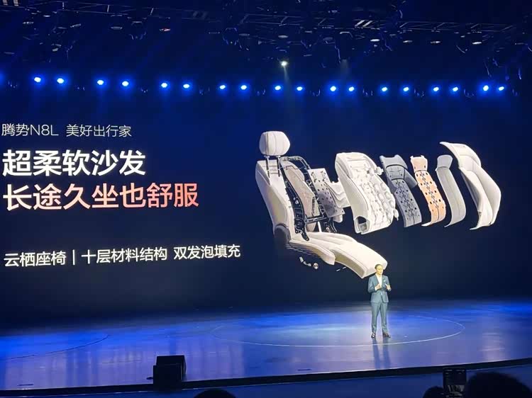 因为是为家而来,整个发布会更突出的是腾势N8L的细节,从空间到舒适到安全的所有可能影响全家出行感受的每一个细节。空间方面,腾势N8L套内面积6.11㎡、人均超1㎡,结合超1.3米车内垂直高度,实现“三排一样大,座座都宽敞”,即便六个1.8米高个子成年人乘坐也非常宽敞,为用户打造“超豪华移动大平层”;而三排最大121°调节角度与100mm前后滑移等设计,更是让第三排和前排一样舒适。