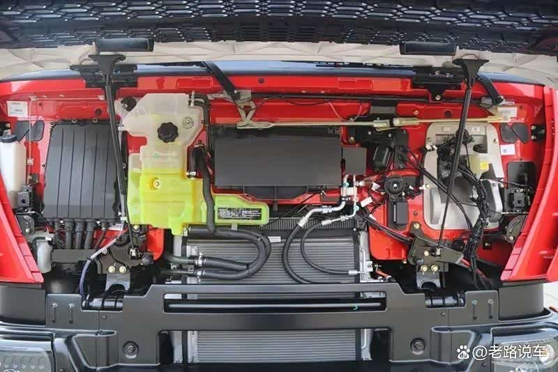前面罩内部管线整齐有序,散热器面积很大,并配有防虫网。
