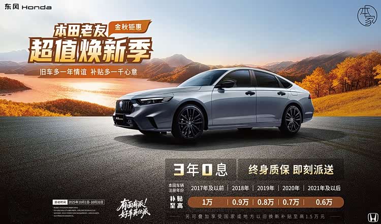 除了产品力上的差异化优势,英仕派在购车政策上也展现出极强的诚意。在本田老友焕新季,根据旧车注册的年份,本田车主可以至高拿到1万元的补贴,叠加国家或地方以旧换新补贴政策,可以至高优惠2.5万元,同时可享受3年0息政策,彻底打破了消费者对“B级车用车成本高”的传统认知,消费者可以用更低的价格享受更高的价值。更关键的是,英仕派还是同级唯一承诺对核心零部件终身质保的车型,燃油版本享发动机和变速器终身质保,覆盖全生命周期维修成本,直击消费者“买得起、养不起”的痛点,更切实解决了消费者的后顾之忧,让消费者在购车后无需担心后期的维修保养问题。