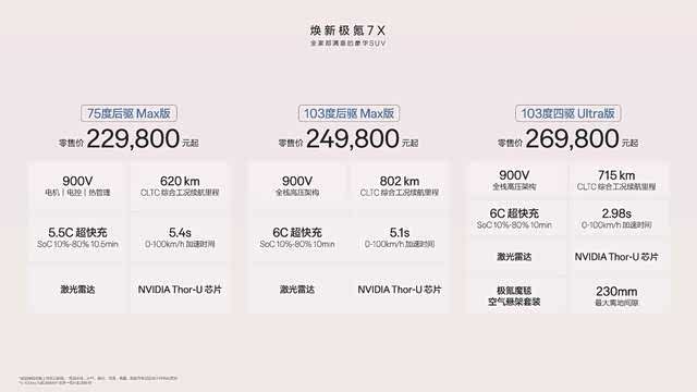 10月28日,“全家都满意的豪华SUV”焕新 极氪7X(参数|询价)正式上市,新车共推75度后驱Max版 、103度后驱Max版、103度四驱Ultra版三款配置版型,官方零售价分别为229,800元、249,800元和269,800元。超级置换权益后限时售价分别为219,800元、239,800元和259,800元。即日起,用户可通过极氪App、极氪官网、极氪小程序、全国各大城市的极氪门店等官方渠道进行预定。