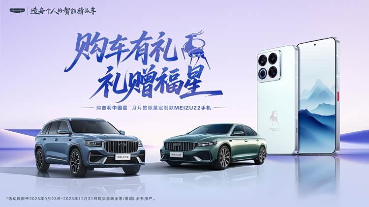 据悉,即日起至10月31日到店试驾中国星星瑞全系、星越L全系车型,可获得“朱炳仁·铜——福禄寿喜葫芦挂件”一份。此外,即日起至12月31日前,针对购买中国星星瑞全系、星越L全系的用户,每月将抽取 300 名幸运用户,赠送中国星东方曜限量定制款 MEIZU 22 手机。