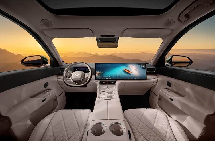 座舱配有17㎡皮质工艺包覆面积,配合全系标配的全车静音玻璃与静音轮胎等配置,构建了深空静谧座舱。同时,风云T11还搭载前排30吋6K一体寰宇屏与17.3吋后舱娱乐屏,结合峰值功率达2880W的7.5.4.2全景声布局的伯牙之音豪华音响与256色律动氛围灯,让每一次出行都是一场影音盛宴。