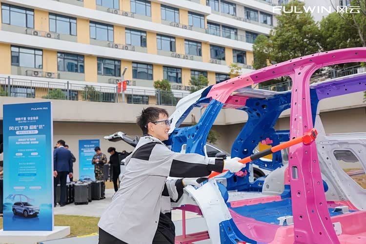 在活动现场的“超能抗”互动环节,风云T9白车身再次经受住了师生们的铁锤电钻考验,直观展现了它的超“钢”硬度和强大抗压性。这一生动演示,让学生们深刻理解到车身钢材强度与结构设计的重要性。