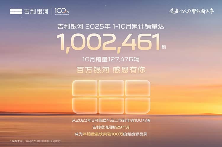 值得一提的是,截止今年10月,2025年吉利银河年度累计销量已突破100万辆,达到1002461辆。自2023年5月吉利 银河L7(参数|询价)发布以来,吉利银河仅历时29个月,便实现年销百万,成为最快达成年销百万的新能源汽车品牌。吉利银河在每一个细分市场中,都为用户提供高质优价、超越期待的好产品,创造出了举世瞩目的“银河速度”,交出了一份年销百万、速度第一、中国唯二、全球前三的满意答卷,再度树立了全新销量里程碑。