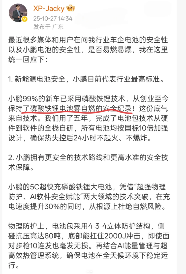 从技术本质来看,磷酸铁锂电池的晶体结构决定了它先天的热稳定性优势。相较于三元锂电池,磷酸铁锂材料在高温、过充等极端条件下更难发生热失控。小鹏在此基础上,通过优化电池管理系统(BMS),实现了对电芯电压、温度的精准管控,同时在电池包结构设计上加入隔热、散热等防护措施,进一步降低了安全风险。但需要明确的是,“0自燃”并非绝对无风险,而是在现有技术体系和使用场景下,通过多重技术手段实现的低风险表现。
