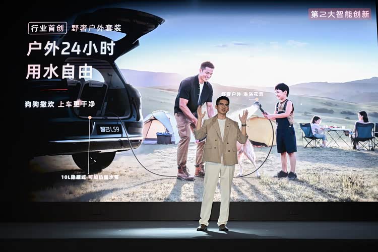最有趣的是智己LS9行业首创了野奢户外套装,在后尾门开启后可安装挂帘,后备箱提供可加热水箱并配以淋浴头,可让车尾秒变淋浴间,在野外实现热水自由,虽然在户外淋浴并不是刚需,但适量的热水喷头可以为孩子挖沙,宠物嬉戏后做一些清洁打理,为用户野外实现更多的玩儿法,倒不失为一个巧思。