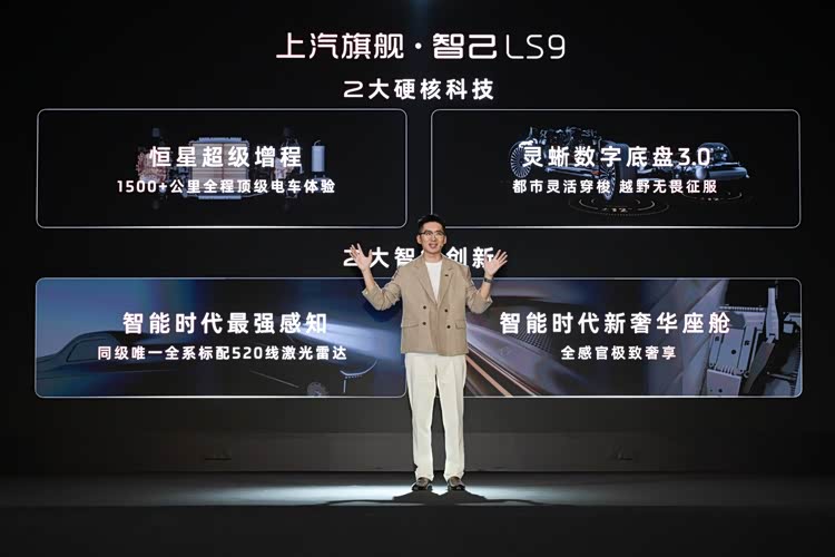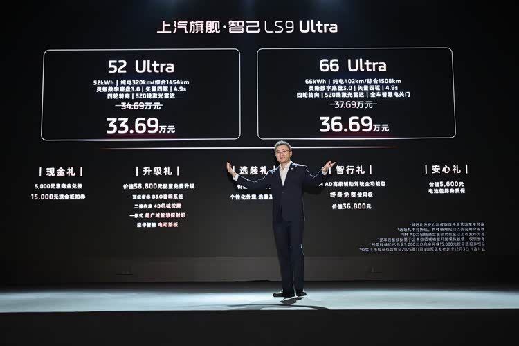 11月4日,智己汽车全新大型旗舰SUV 智己LS9(参数|询价)正式开启预售,全系共推出两款车型,分别为52 Ultra和66 Ultra,搭载55kWh和66kWh电池包,预售价分别为33.69万和36.69万,全系搭载“恒星”超级增程和新一代灵蜥数字底盘3.0,CLTC纯电续航分别为320km和402km,并提供现金礼、升级礼、选装礼、智行礼和安心礼五大权益。新车将于11月12日正式上市,并在2026年一季度推出三电机的智己LS9 Hyper版本。