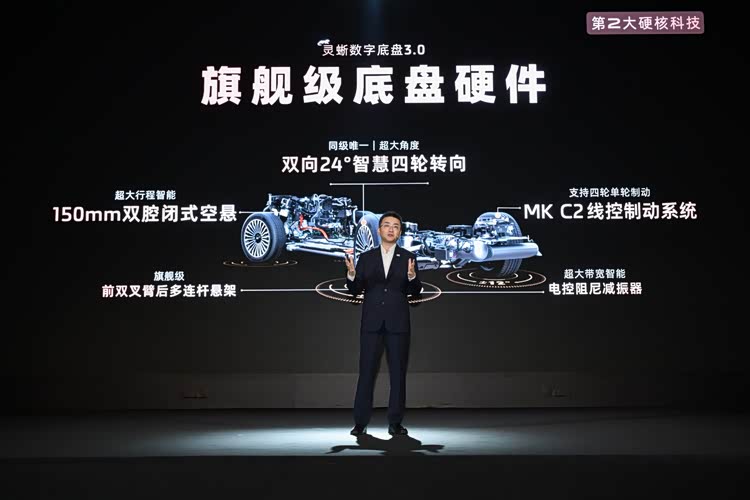 全系标配的灵蜥数字底盘3.0,采用同级唯一的双向24度智慧后轮转向,让这台5.2米级的大型SUV拥有4.95m的最小转弯半径,可以更好的胜任狭窄路段、魔鬼地库的闪转腾挪。150mm超大行程的双腔闭式空气悬架,配以智能电控阻尼调节系统和前双叉臂后多连杆悬架,让智己LS9在高速过弯、碎石颠簸路面均能又更加出色的乘坐表现。