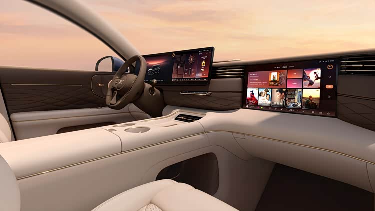 内饰部分,作为旗舰车型智己LS9自然是武装到了牙齿,并引领了新的风潮。首先仪表与中控屏组成的27.1英寸一体式联屏和15.6英寸3K副驾娱乐屏沿用了智己LS6的设计风格,但后排娱乐屏的尺寸达到21.5英寸4K高清,同时12.3L双开门冰箱与全车三零重力座椅一应俱全。