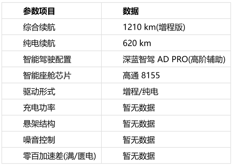 提供增程与纯电两种动力方案,其中增程版综合续航可达约1210km,纯电版CLTC续航可达620km,兼顾长途出行与纯电通勤需求;座舱搭载高通8155芯片与15.6英寸大屏,配合深蓝智驾系统支持多场景辅助驾驶,整体在智能体验与出行效率方面表现均衡。