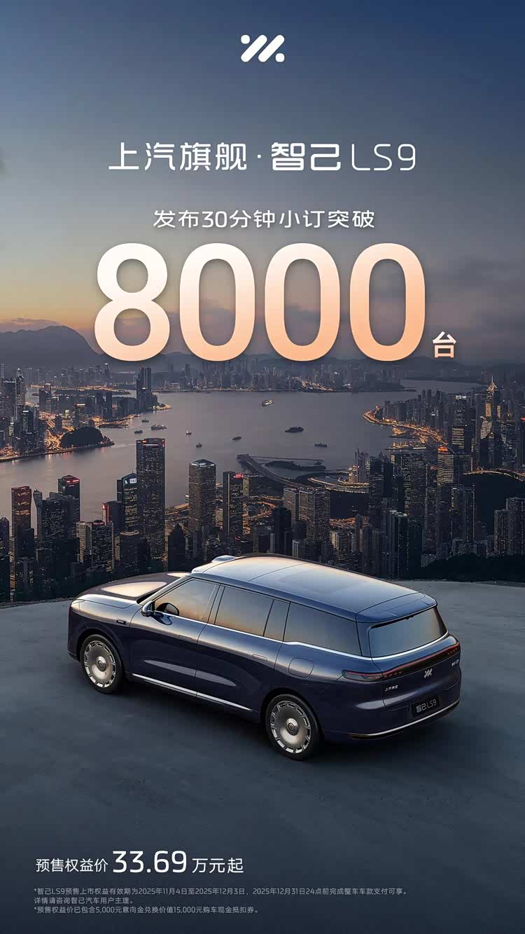 据官方披露,智己LS9预售33.69万起,起步即为Ultra,发布30分钟,小订已破8000台。
