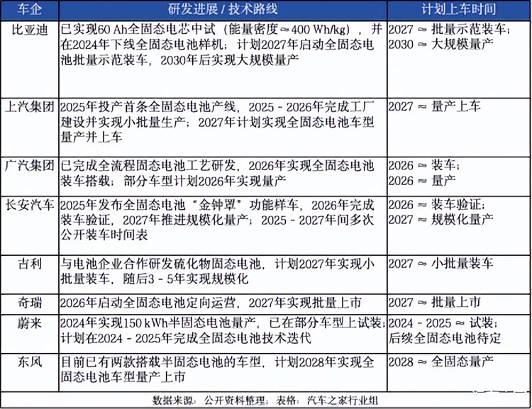 欣旺达推出新一代聚合物全固态电池“欣·碧霄”,孚能科技计划于今年底推出并即将交付第一代硫化物全固态电池,采用高镍三元正极与高硅负极,能量密度达400Wh/kg。天津大与清华大学研究团队通过联合攻关,突破了固态电池在大电流密度和低温工况下循环稳定性差的瓶颈。宁德时代的硫化物全固态电池研发团队已扩大至1200人,公布的20Ah样品能量密度达到450Wh/kg,比亚迪计划于2027年启动全固态电池的批量示范装车,并在2030年前实现大规模应用。