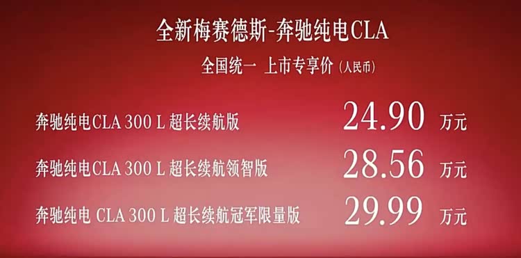 2025年11月5日,全新梅赛德斯-奔驰纯电 CLA正式上市,推出纯电 CLA 300 L超长续航版、纯电 CLA 300 L超长续航领智版、纯电 CLA 300 L超长续航冠军限量版(100台限量发售)3款车型,售价区间:24.9万元-29.9万元。