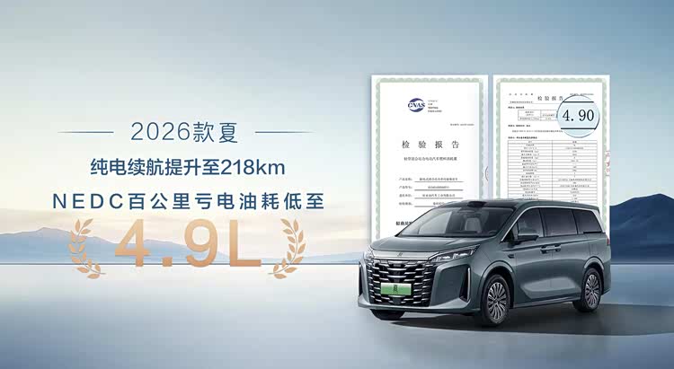 电池与续航方面,2026款夏搭载了更大容量的磷酸铁锂刀片电池,高配车型的CLTC纯电续航从180公里提升至218公里,增幅达21%。其NEDC亏电油耗也降至4.9L/100km,综合续航达1163公里,解决MPV高油耗痛点。