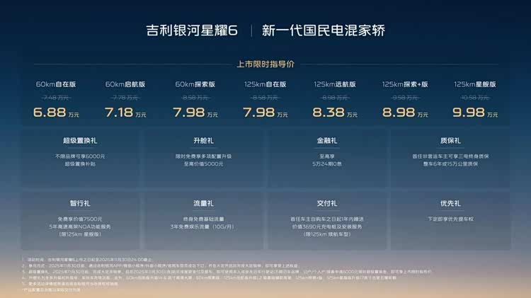 配置方面,此次吉利银河星耀6一共推出7个版本的车型,主要区分为60KM纯电续航和125km纯电续航两大版本。限时售价6.88万元-9.98万元。