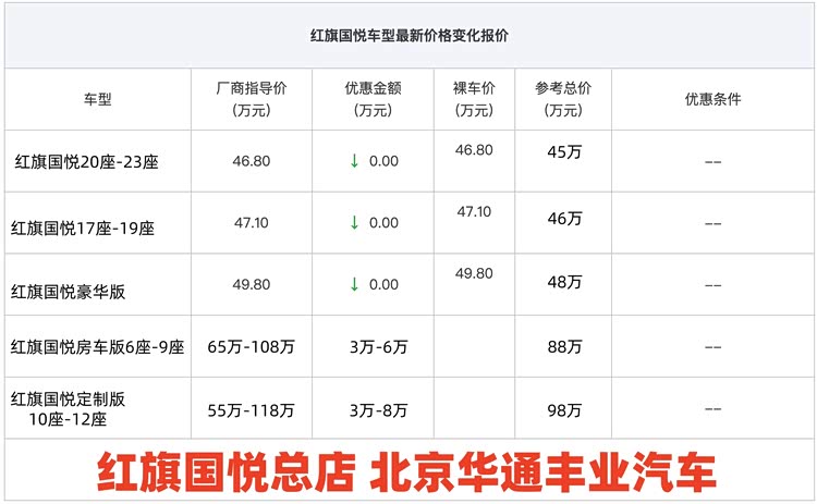 车家号·0浏览·2025-11-07 11:55 · 北京红旗国悦(参数|询价)6-23座支持私人订制改装,41万到168万价位区间,6-9座房车版68万到108万,10座到12座88万到148万,13座到23座41万到88万,车型外观多种颜色可选择。