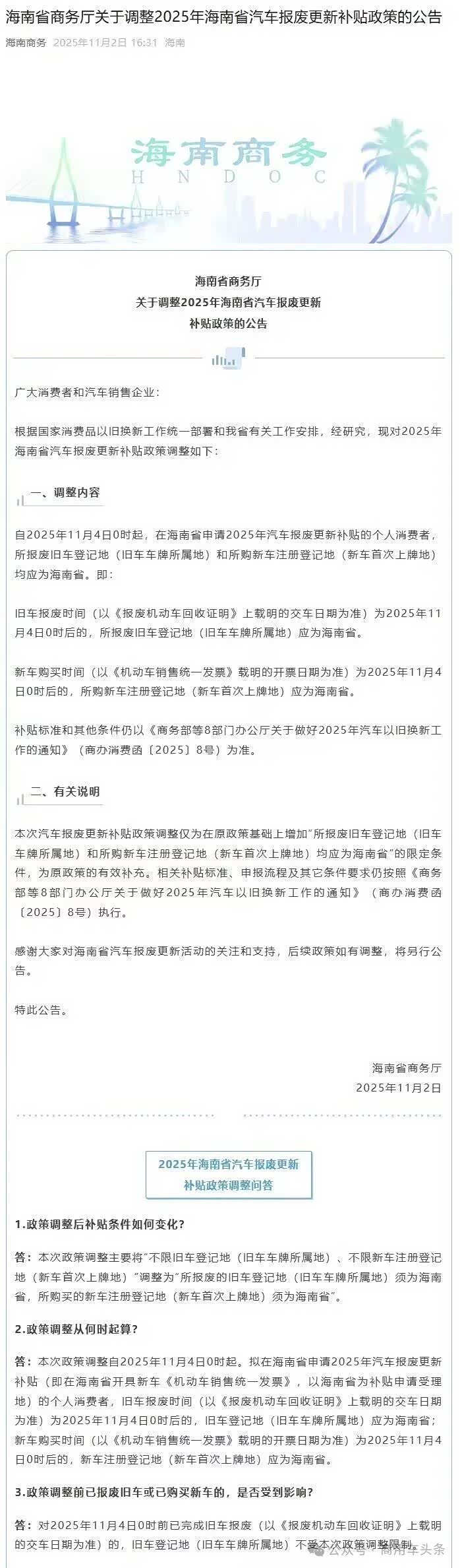 11月2日,海南省商务厅发布关于调整2025年海南省汽车报废更新补贴政策的公告,调整如下: