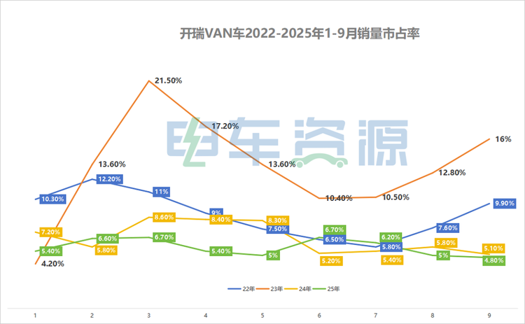开瑞VAN车“掉队”更具体地体现在市占率变化上。开瑞VAN车近4年1-9月销量和市占率,验证了其面系车的衰落轨迹。2022年上半年开瑞VAN车延续微面时代的优势,市占率在10%左右,中面车型异军突起后受到短暂冲击,随着开瑞江豚宽体中面上市,迅速抢回市占率。2023年开瑞中面持续发力市占率在3月达到新高,后受7方大面冲击,有所回落,但依然保持在10%以上。而2024年和2025年开瑞VAN车市占率基本上在10%以下,甚至有的月份跌破5%。