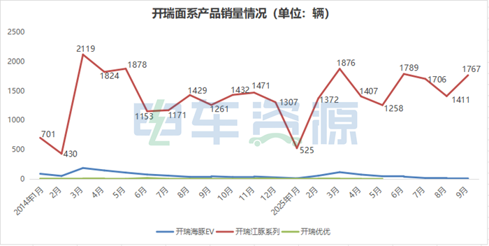 从2024年到2025年,其旗下开瑞优优、海豚EV月均销量不足百辆,而主打产品开瑞江豚系列的月均销量在1200-1900辆的区间内窄幅波动,已经落后昔日同梯队的友商,还被部分后面的车企反超。