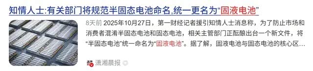 不过好消息是,最近有消息曝出,相关主管部门正在考虑进一步规范固态电池话术,酝酿出台一份文件,将“半固态电池”统一命名为“固液电池”。