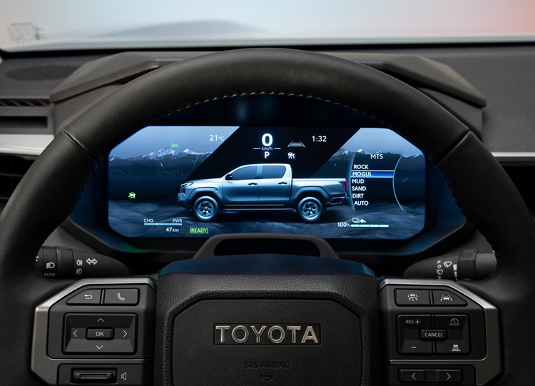 内饰部分,全新HiLux实现了全方位的革新,显著提升了现代感、乘坐舒适度、人机交互体验与科技氛围。中控台采用创新的三层式布局,不仅优化了前方视野,尤其在越野路况下能为驾驶者提供更佳的行车视野与操控信心。