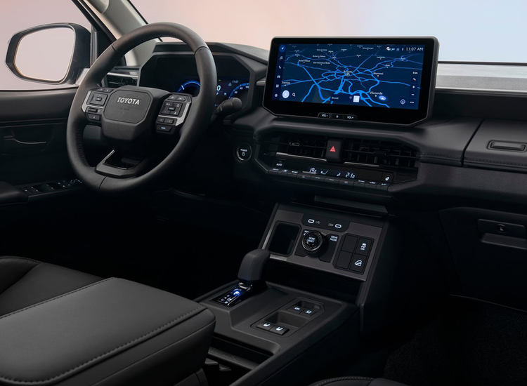 全系标配全新数字仪表盘:WorkMate与SR车型搭载7英寸显示屏,SR5及以上配置则升级为12.3英寸全液晶仪表。同时,所有车型均配备12.3英寸中央触控屏,内置新一代多媒体系统,支持无线Apple CarPlay®及Android Auto™,集成嵌入式卫星导航、智能语音识别控制及扩展型丰田智联服务。空调控制面板采用直观的大尺寸按键与旋钮组合,确保行车过程中可安全便捷地操作。新设计的多功能方向盘握感更舒适,按键分区明确,涵盖娱乐信息、音频控制与驾驶辅助三大功能模块,部分高配车型还提供方向盘加热功能。