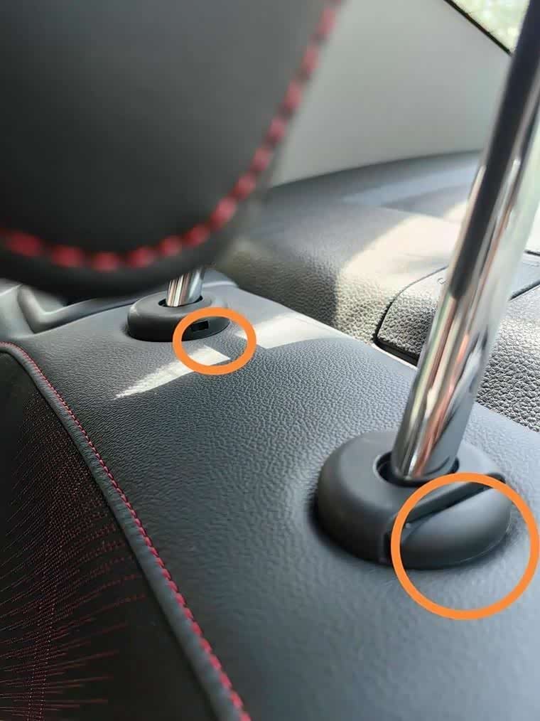 1. 探寻汽车头枕两侧支撑杆底部的特定塑料按键,此按键通常位于一侧。