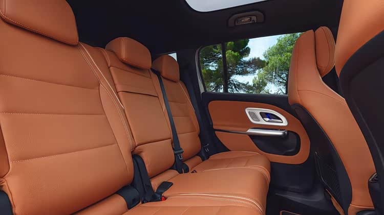 与新款CLA一样,新款GLB的中控也配备了三块大屏,10.25英寸全液晶仪表盘和两块14英寸触控屏,不得不说这造车新势力的味道太重了,挡住LOGO,谁敢说这是奔驰?MBUX Superscreen系统为选配,入门级车型将不配备副驾驶侧显示屏。全系标配了全景天幕,而可发光的星徽图案和可变透明度功能也是选配,可通过信息娱乐系统中的虚拟按钮实现透明与不透明的切换。